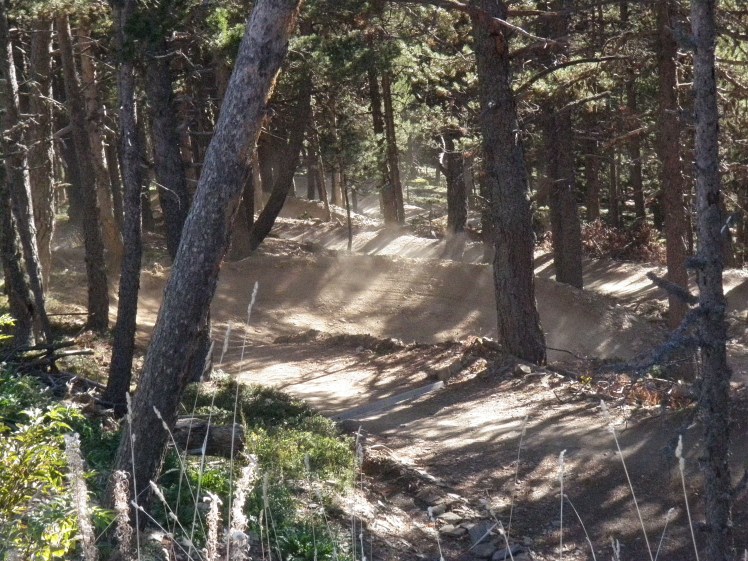 L’autre nouveauté de Vallnord, c’est la piste des Championnats du Monde qui ont eu lieu le mois dernier. Elle est parallèle à l’autre noire (le tracé de la Maxiavalanche). Tout en sous bois, elle est peu caillouteuse, plutôt en terre et en racines, bien marquée encore par le passage des pilotes. Sa principale difficulté est une portion super raide, à négocier sans trop réfléchir ! Ses gros sauts sont fermés au grand public (personnellement, ça ne me dérange pas !), ainsi que sa toute dernière partie, qui passe dans des propriétés privées et qui est donc ouverte uniquement pour les compétitions.