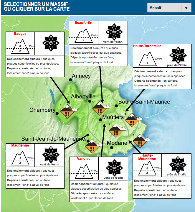 Ces prévisions sont aussi données par téléphone au 08 99 71 02 73 (Bourg Saint Maurice) 08 99 71 02 74 (Chamonix) ou 08 99 71 02 05 (Briançon).